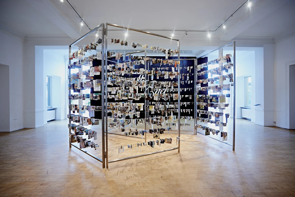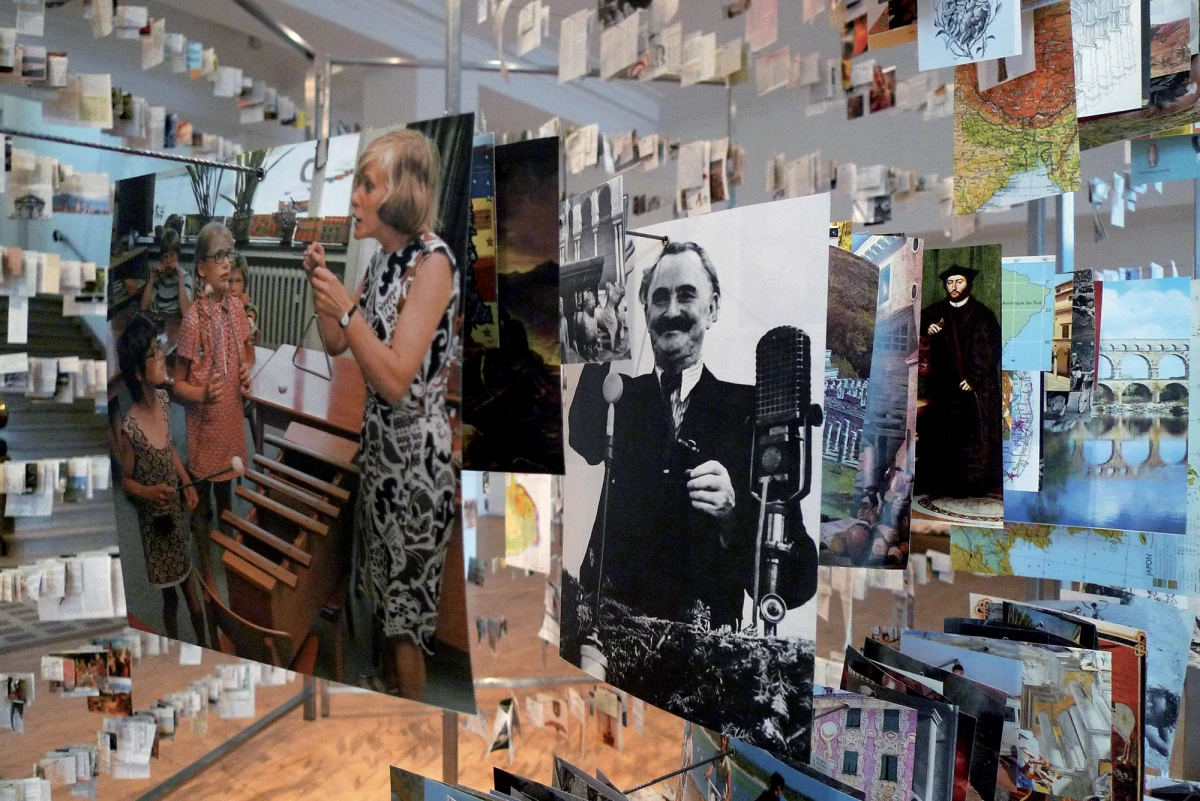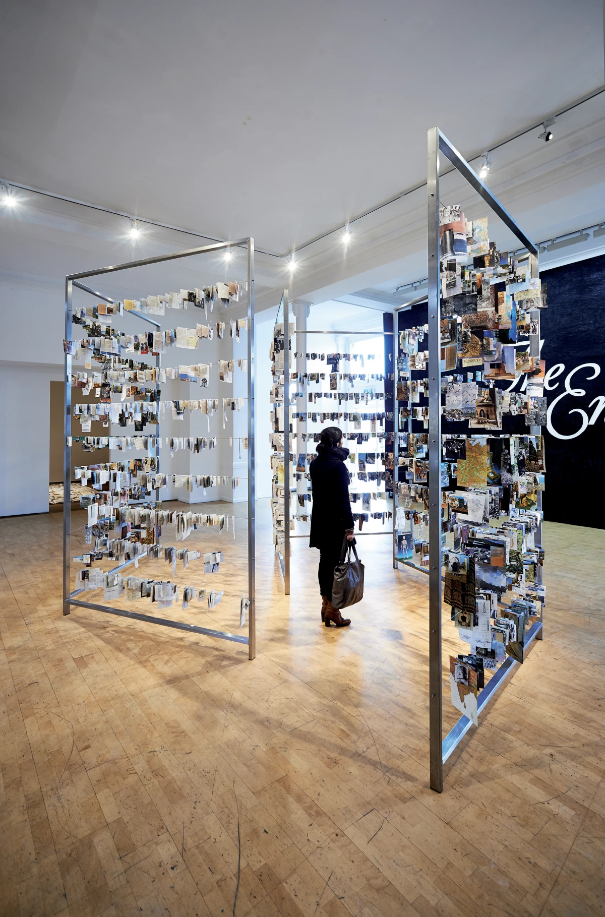 Metallic frames assembled like giant screens are strung with stainless steel cables from which hang thou sands of pictures cut from encyclopaedias of various kinds and origins. The screens form a sort of maze or barrier that can be circumvented or traversed in various ways. The perforated pictures hang from the cables to create a subjective, fragmentary narrative of history in motion. The uncaptioned images appeal to the viewer’s memory and summon up personal recollections and experiences.