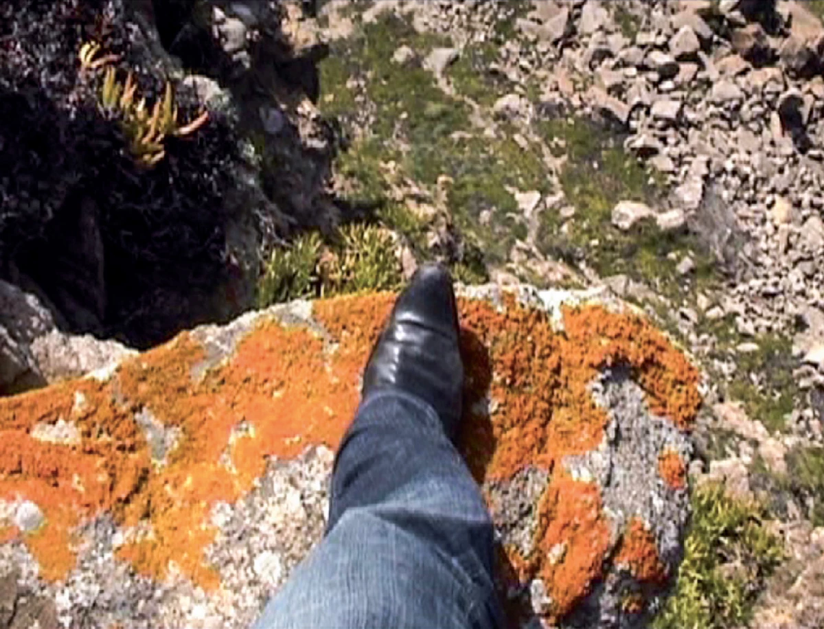of a two-channel video projection in which the artist films himself walking on the Atlantic coast, following the contours and rhythms of the jagged Cabo da Roca headland to its farthest reach. Portugal’s Cabo da Roca is the westernmost point of continental European. Without physical preparation or adequate equipment, the body is at constant risk of slipping. The sense of danger sustained by the life-size projection is amplified in the moments when the voids encountered in descending and climbing back up the cliff overlap.