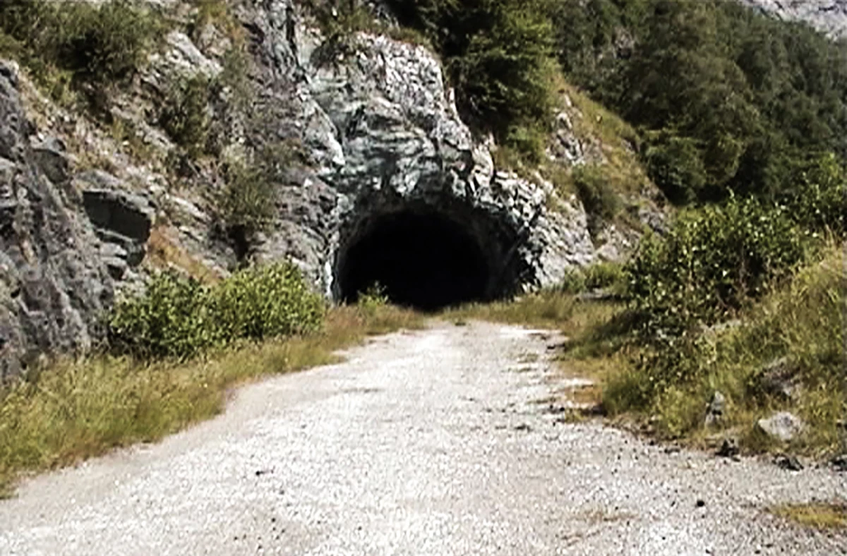 While strolling the Norwegian countryside with the writer Tomas Espedal, the artist accidentally comes upon the entrance of an abandoned tunnel. This single-shot video documents the two men’s trek through the underground stone passage. Camera in hand, the artist films the entire time, even when they find themselves in pitch-black darkness.