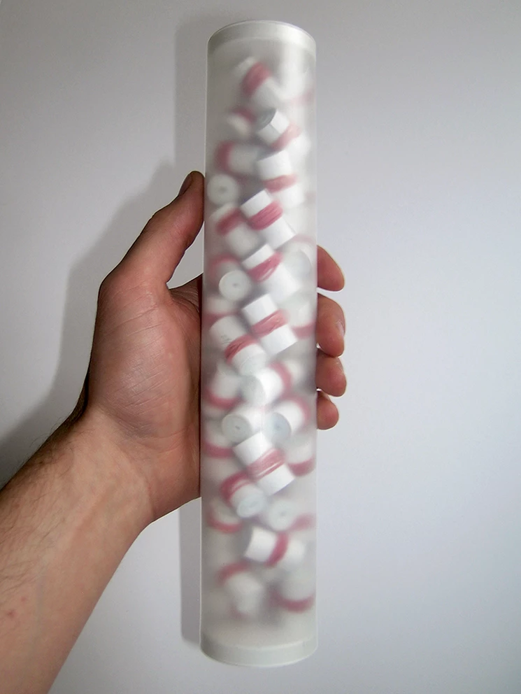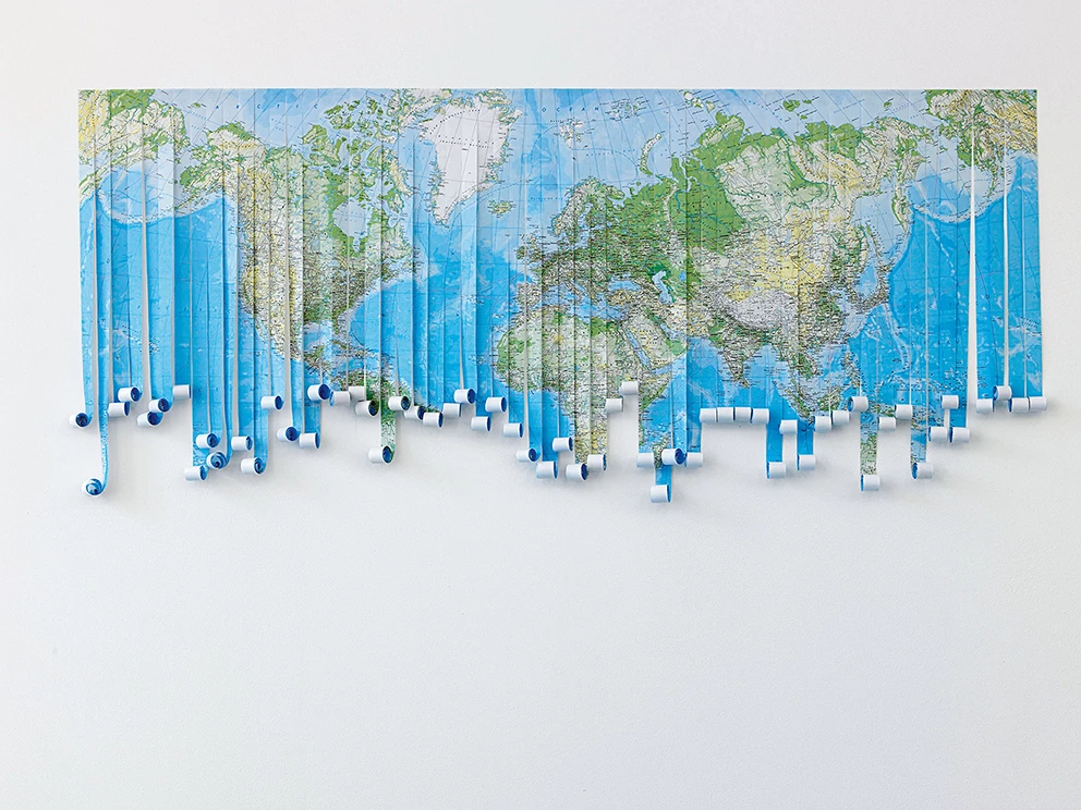 Le Monde nomade #1 is divided into 60 strips (instead of 24 time zones) rolled up by the artist, forming arbitrary longitudes and latitudes. This shifting world can be carried in a case, displayed on a wall in its conventional version or reconstructed by interweaving the continents. The simple distortion engenders a dreamlike worldview that inspires wanderlust and imagination, as well as reflection on the state of the world and the consequences of the fictional transpositions.