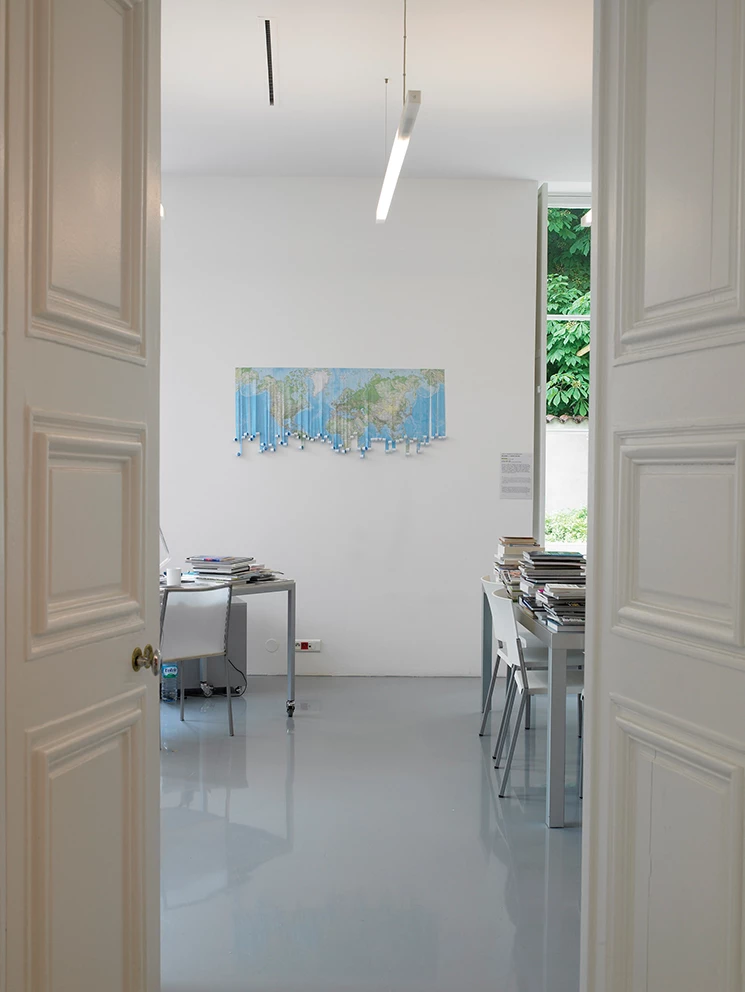 World map cut into 60 strips, ongoing work during the length of the exhibition
