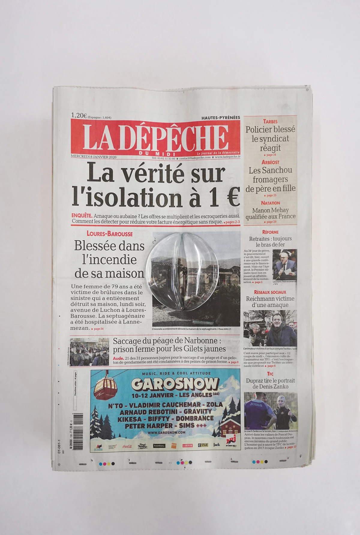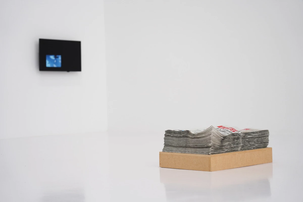 Set on the floor like paperweights on a pile of local newspapers – renewed daily – two crescent moon-shaped magnifying glasses seem to question the world’s future through everyday events. These crystal objects are modeled on the divination tools called moon blocks, or jiaobei, used in pairs in prophetic rituals in traditional Chinese temples and shrines, often along with fortune sticks. Supplicants toss the red-painted wooden crescents on the floor like dice to obtain Yes or No answers to questions put to the gods. The video that accompanies the installation shows these objects being used in temple ceremonies in Taipei, Taiwan. By reproducing in crystal the jiaobei he brought back from Taipei, the artist operates a cultural shift, invoking the divinatory arts practiced in the Western world.